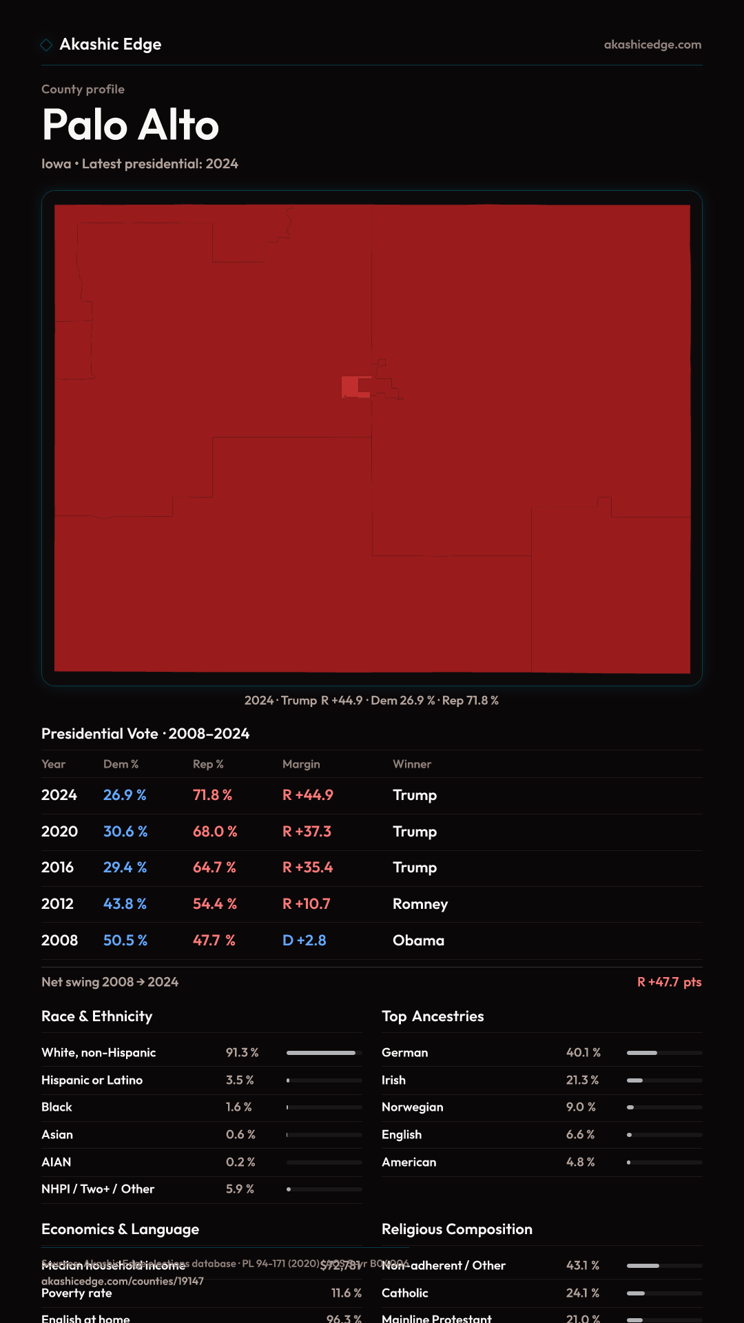 Shifted 7.6pp toward Republicans in 2024 — 40 presidential elections on record