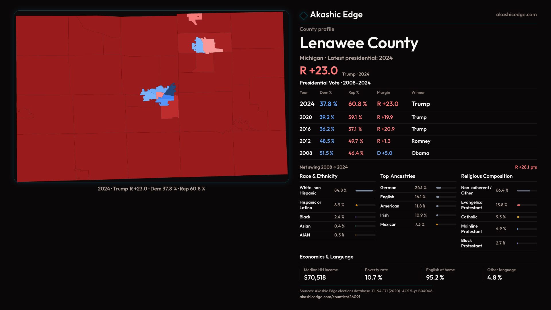 Shifted 3.1pp toward Republicans in 2024 — 40 presidential elections on record