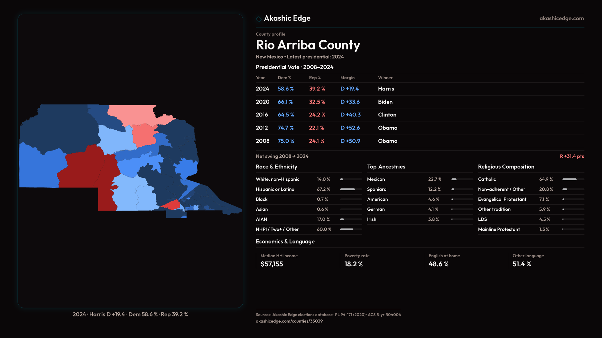 Safe Democratic — shifted 14.2pp toward Republicans in 2024 — 29 presidential elections on record