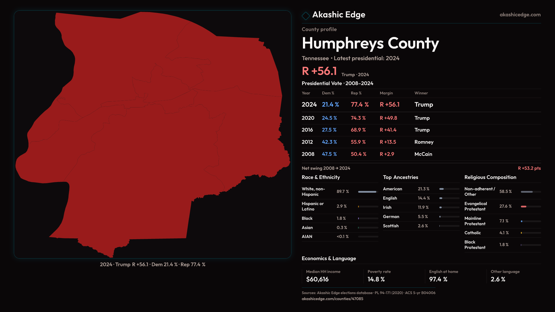 Shifted 6.2pp toward Republicans in 2024 — 40 presidential elections on record