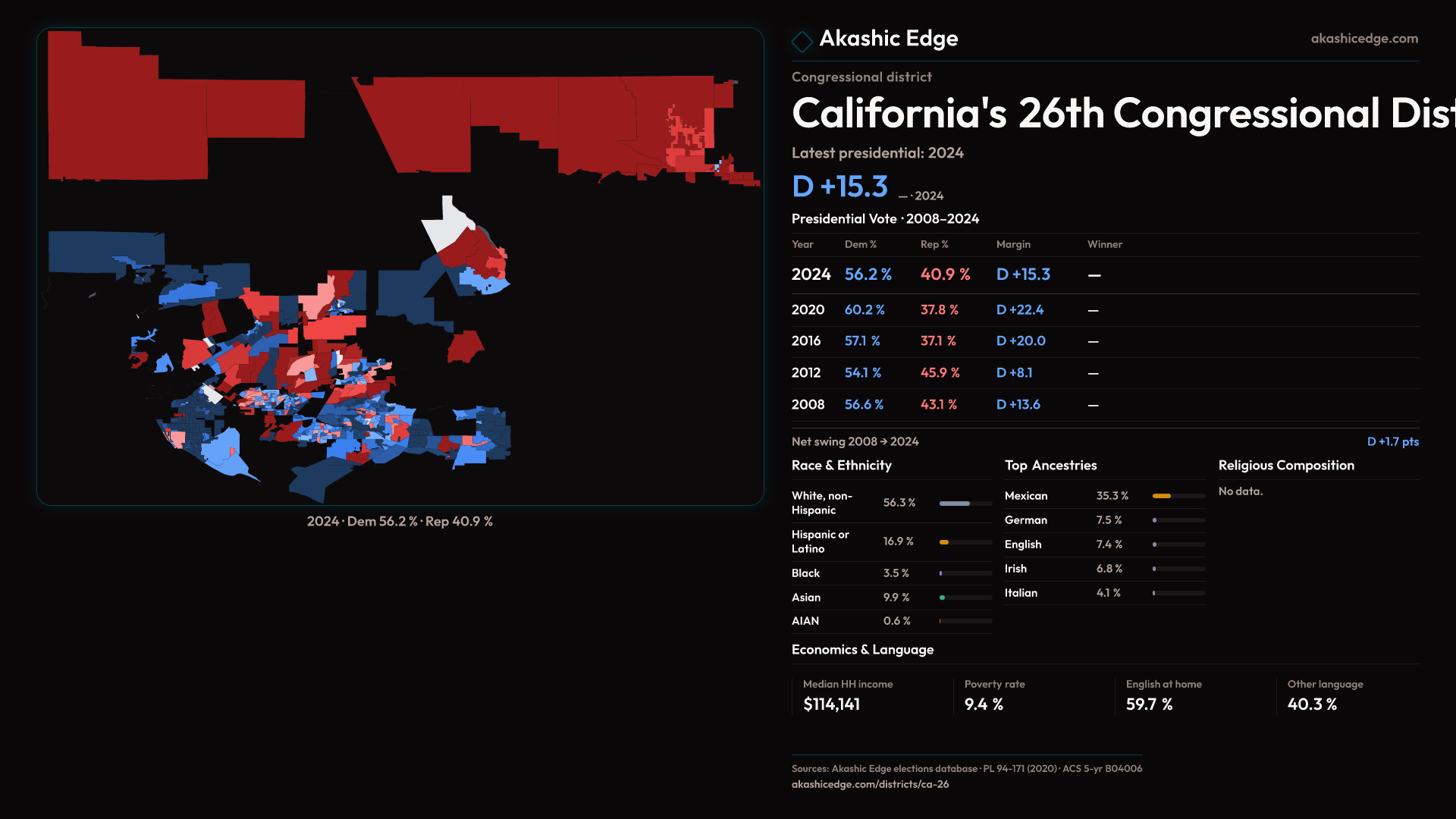 See how each split precinct fragment inside CA-26 voted, swung, and lines up demographically.