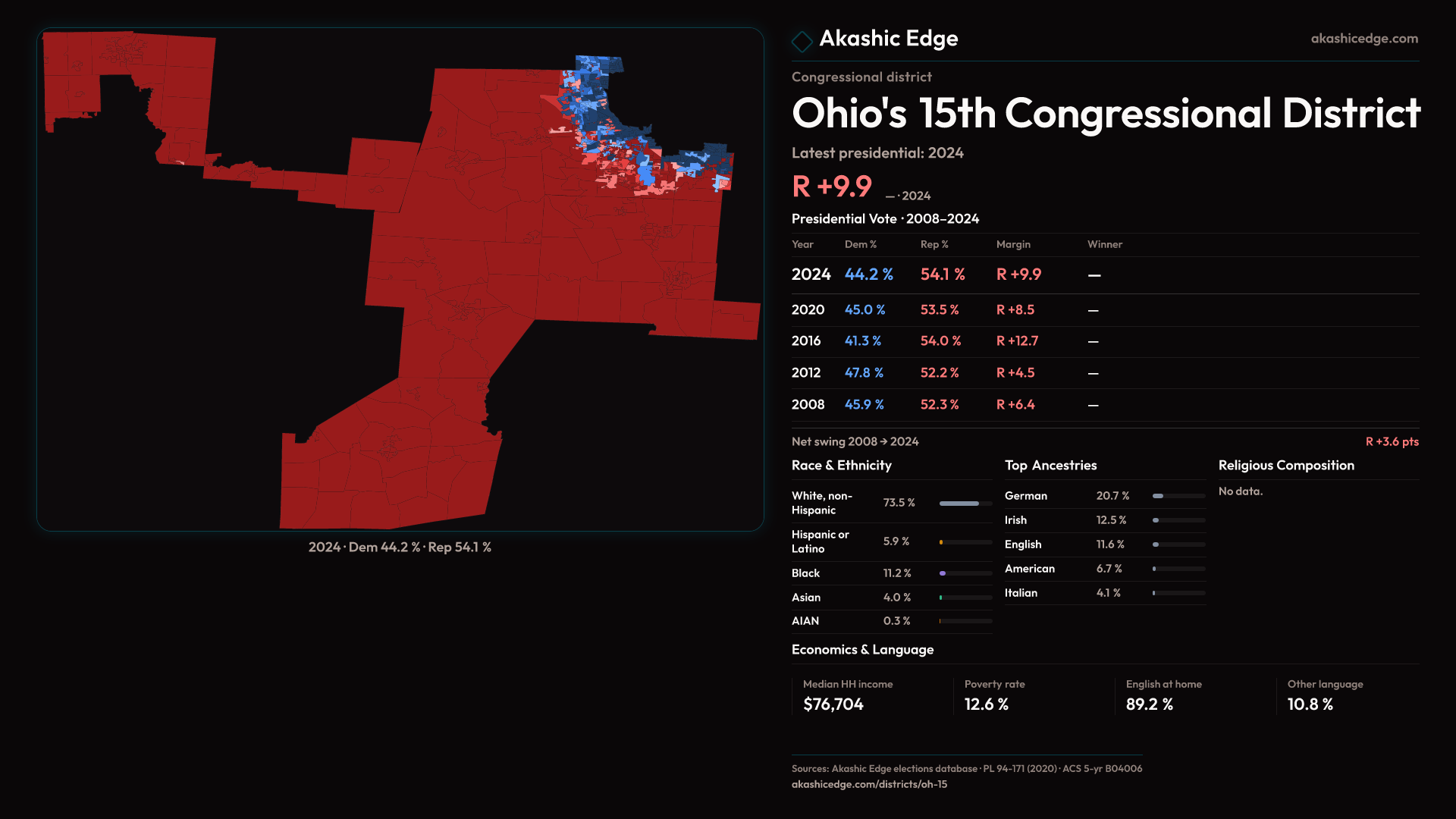See how each split precinct fragment inside OH-15 voted, swung, and lines up demographically.