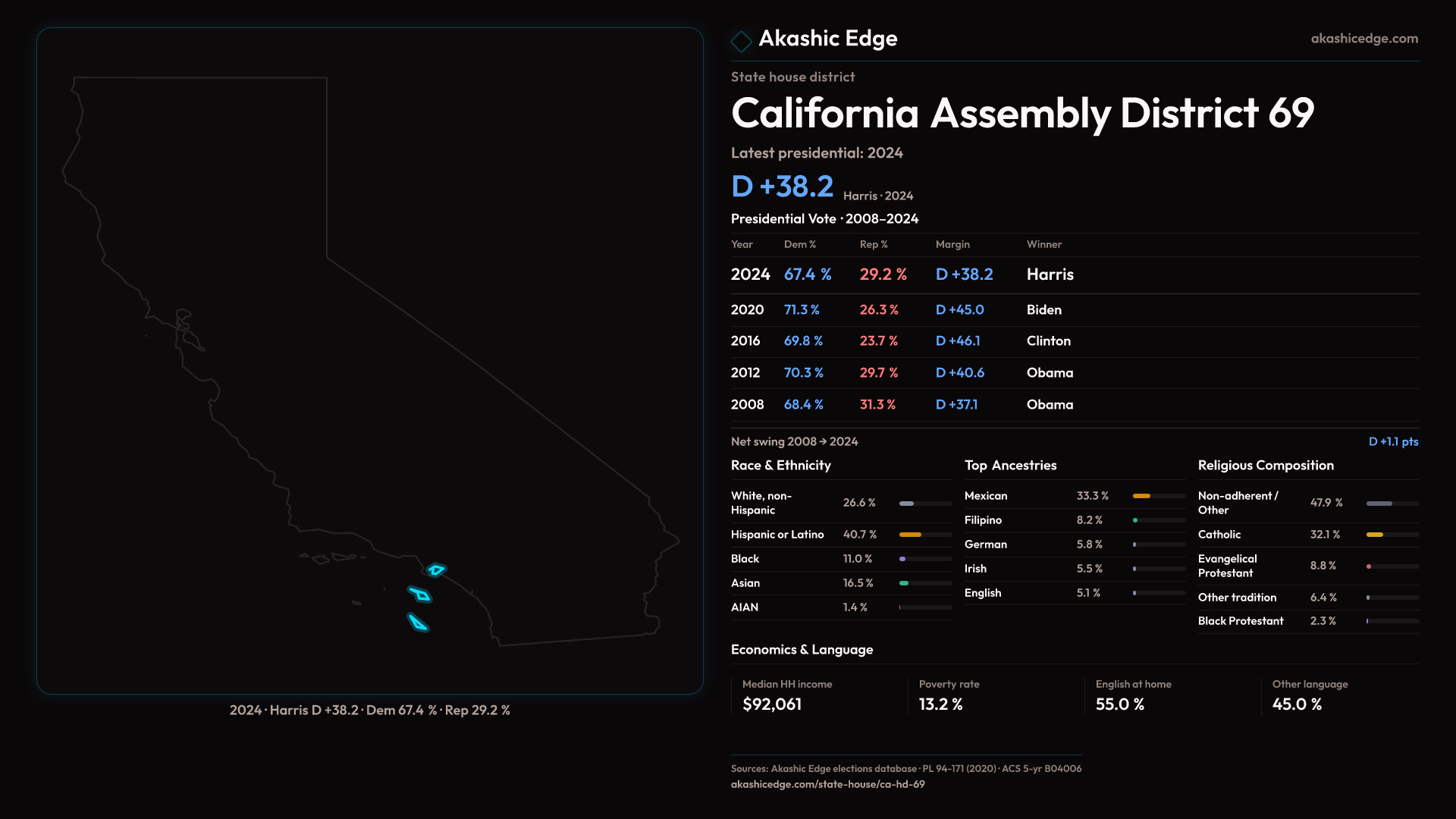 Who lives in California Assembly District 69? 477,795 residents as of the 2020 Census.