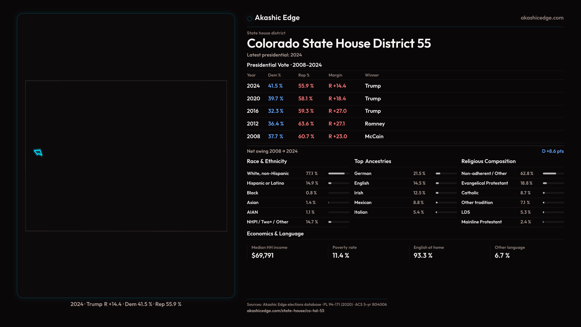 Leans Republican — shifted 4.0pp toward Democrats in 2024 — 87K residents
