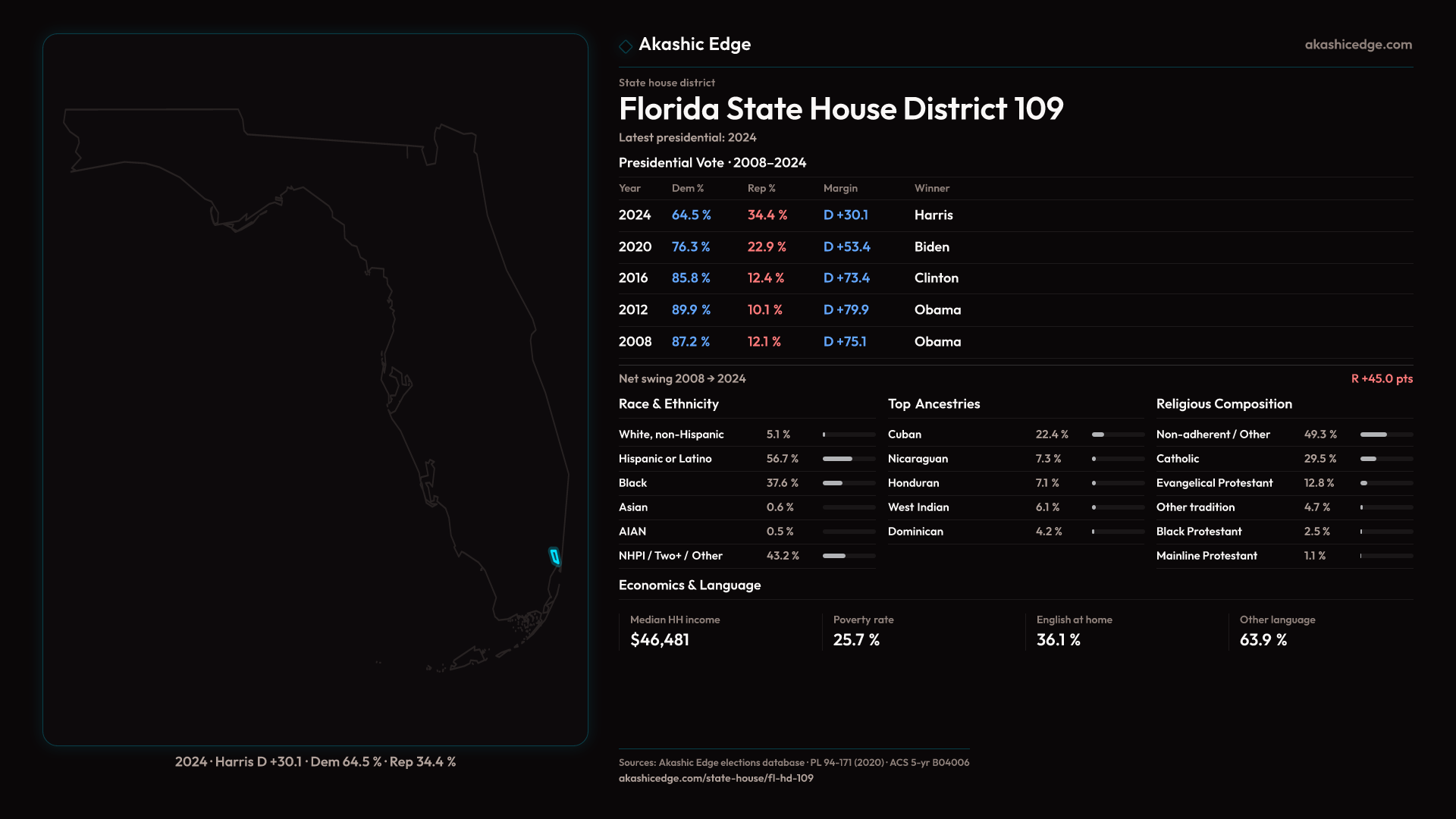 Shifted 23.3pp toward Republicans in 2024 — 183K residents