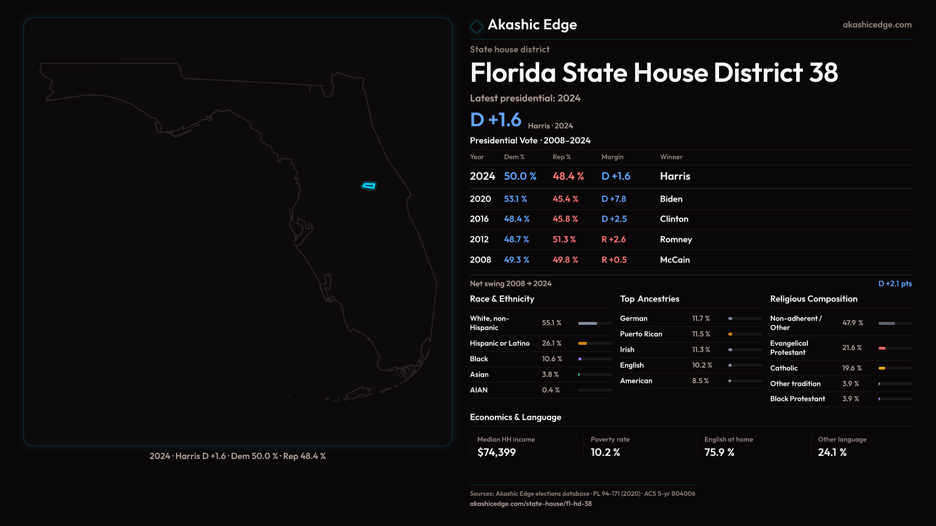 Who lives in Florida State House District 38? 175,442 residents as of the 2020 Census.