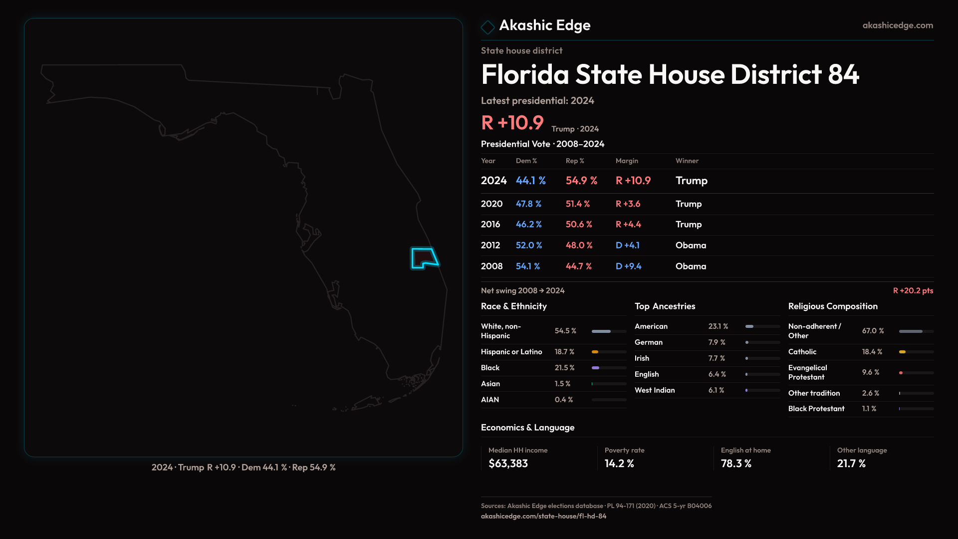 Who lives in Florida State House District 84? 183,408 residents as of the 2020 Census.