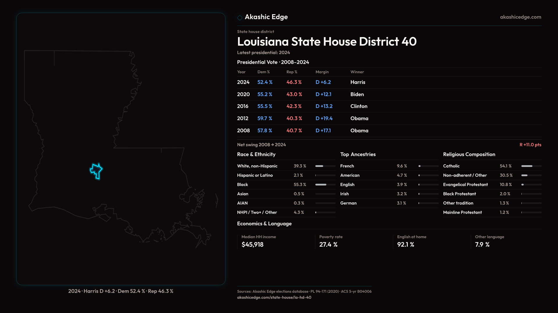 Leans Democratic — shifted 6.0pp toward Republicans in 2024 — 45K residents
