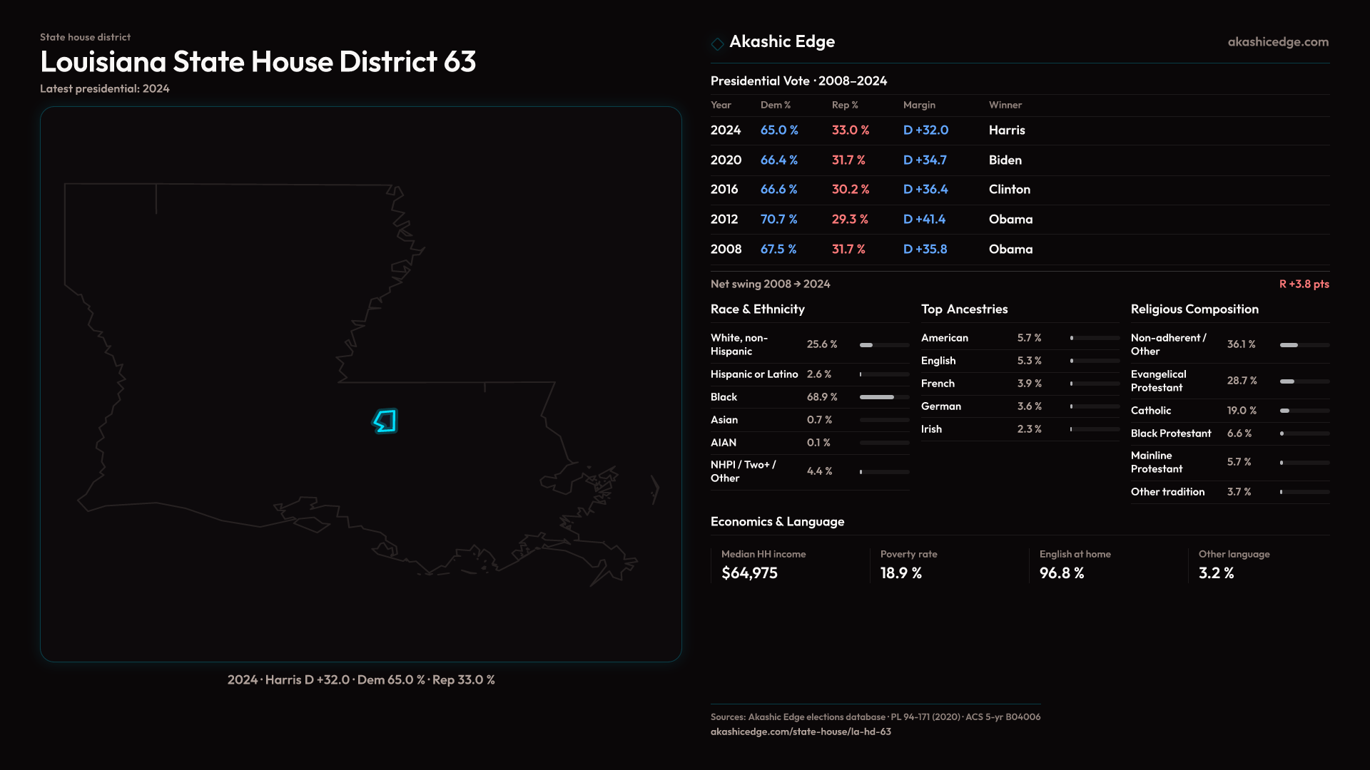 Read this geography's profile in three layers: local, state (where available), and national baseline.