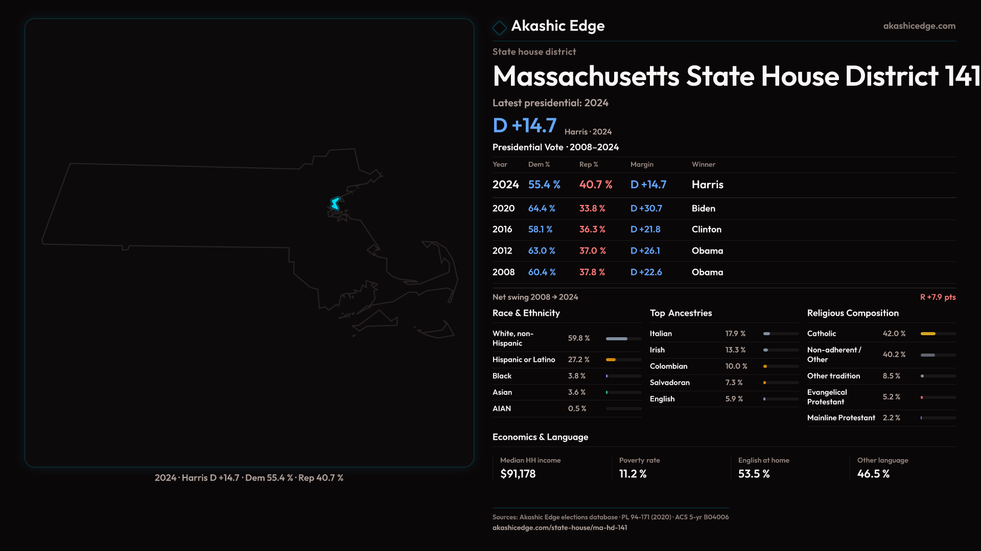 Who lives in Massachusetts State House District 141? 43,879 residents as of the 2020 Census.