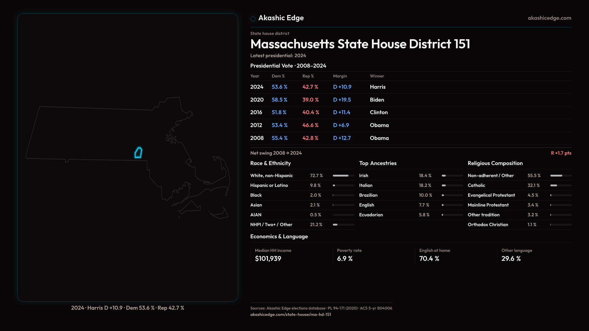 Who lives in Massachusetts State House District 151? 42,624 residents as of the 2020 Census.