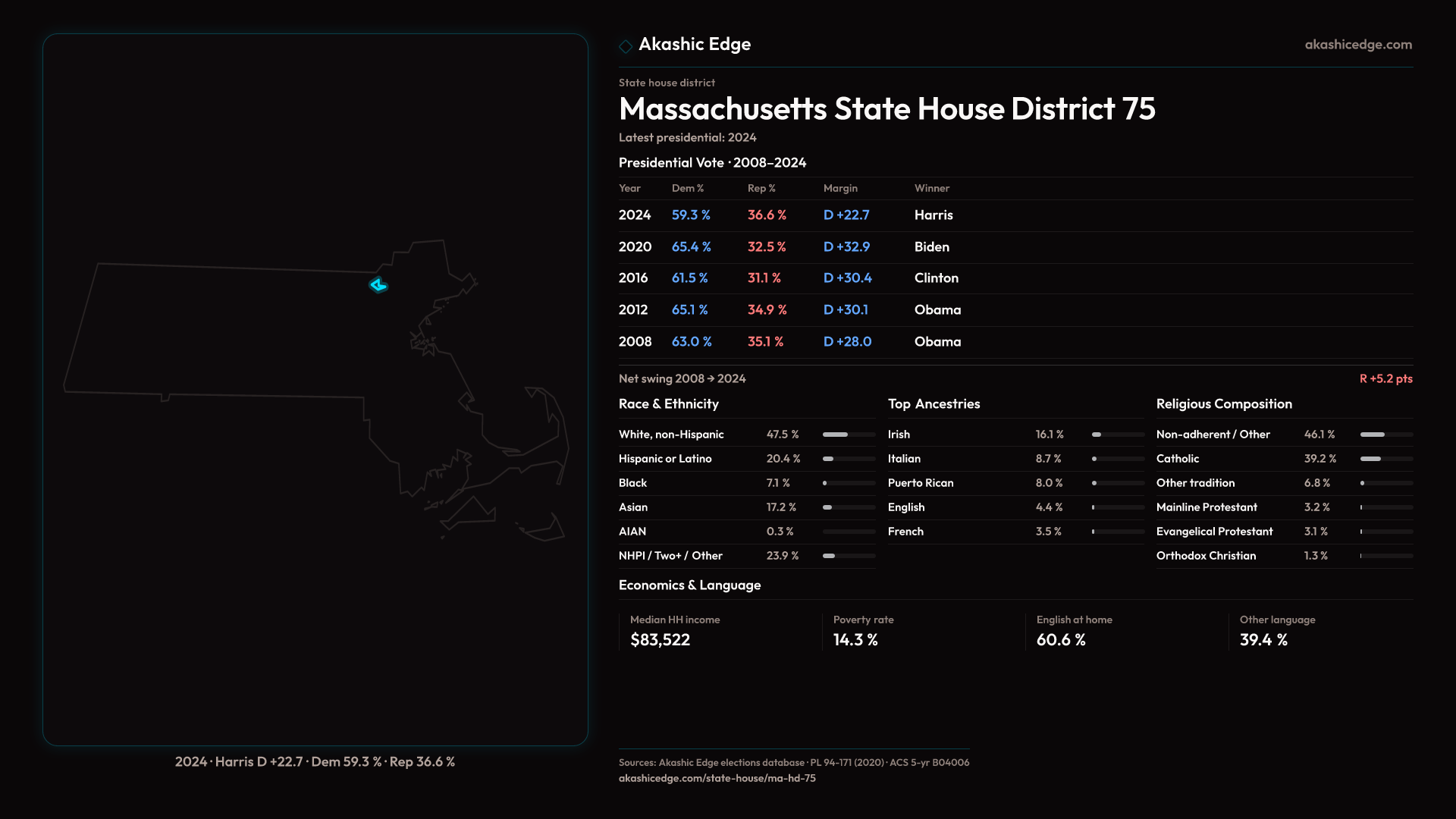 Who lives in Massachusetts State House District 75? 44,424 residents as of the 2020 Census.