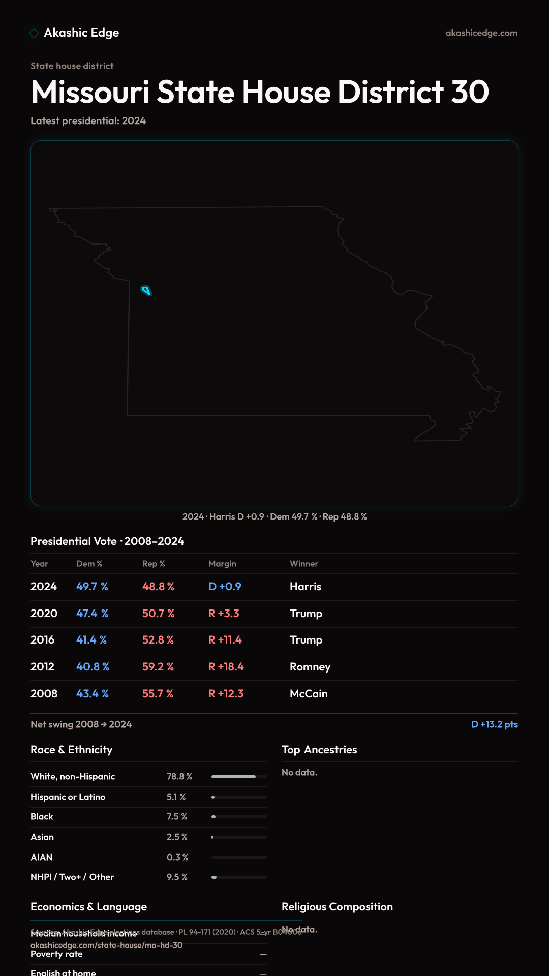 Who lives in Missouri State House District 30? 37,486 residents as of the 2020 Census.