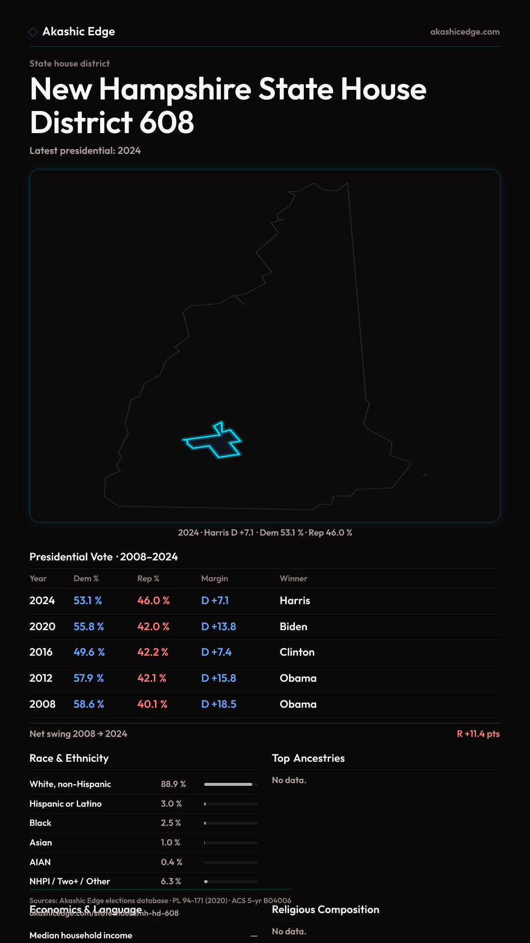 Who lives in New Hampshire State House District 608? 10,784 residents as of the 2020 Census.