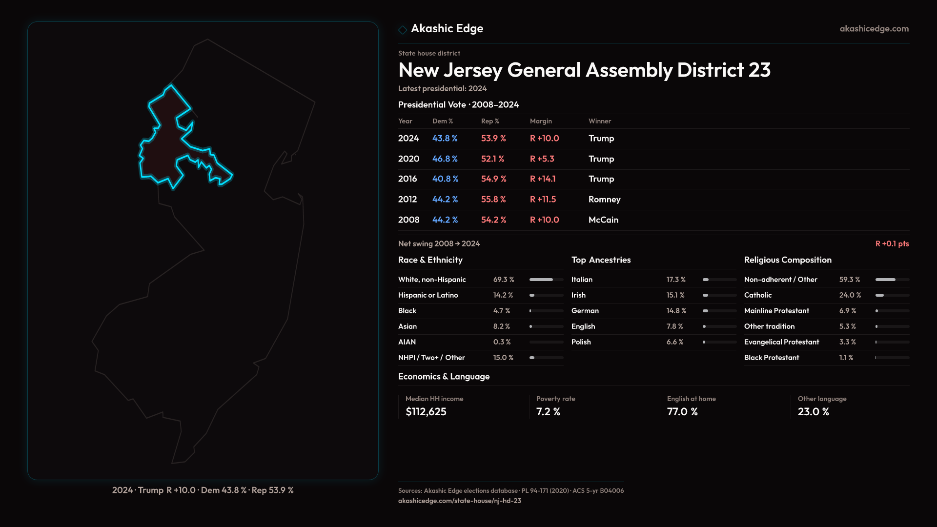 Who lives in New Jersey General Assembly District 23? 237,900 residents as of the 2020 Census.