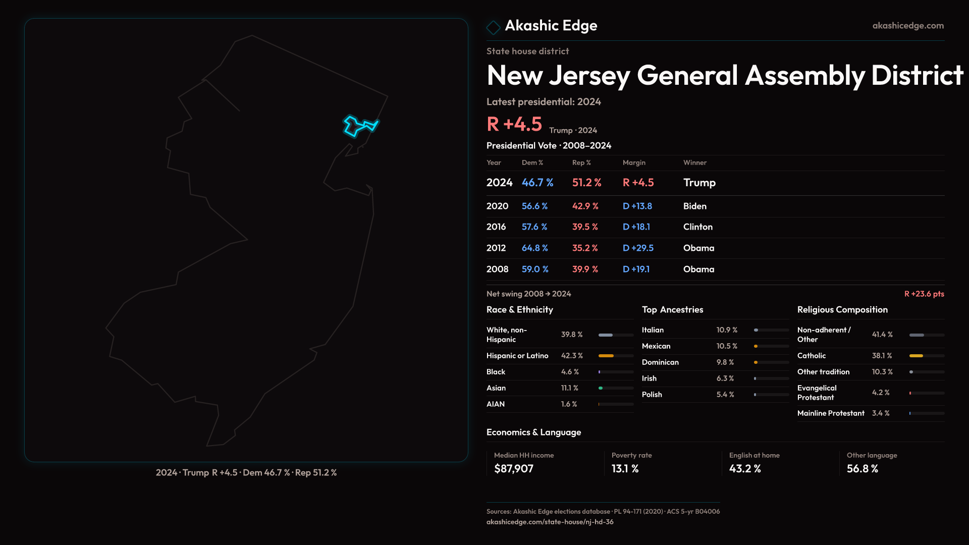 Who lives in New Jersey General Assembly District 36? 233,301 residents as of the 2020 Census.