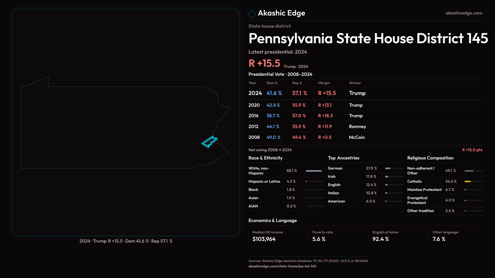 Who lives in Pennsylvania State House District 145? 63,075 residents as of the 2020 Census.