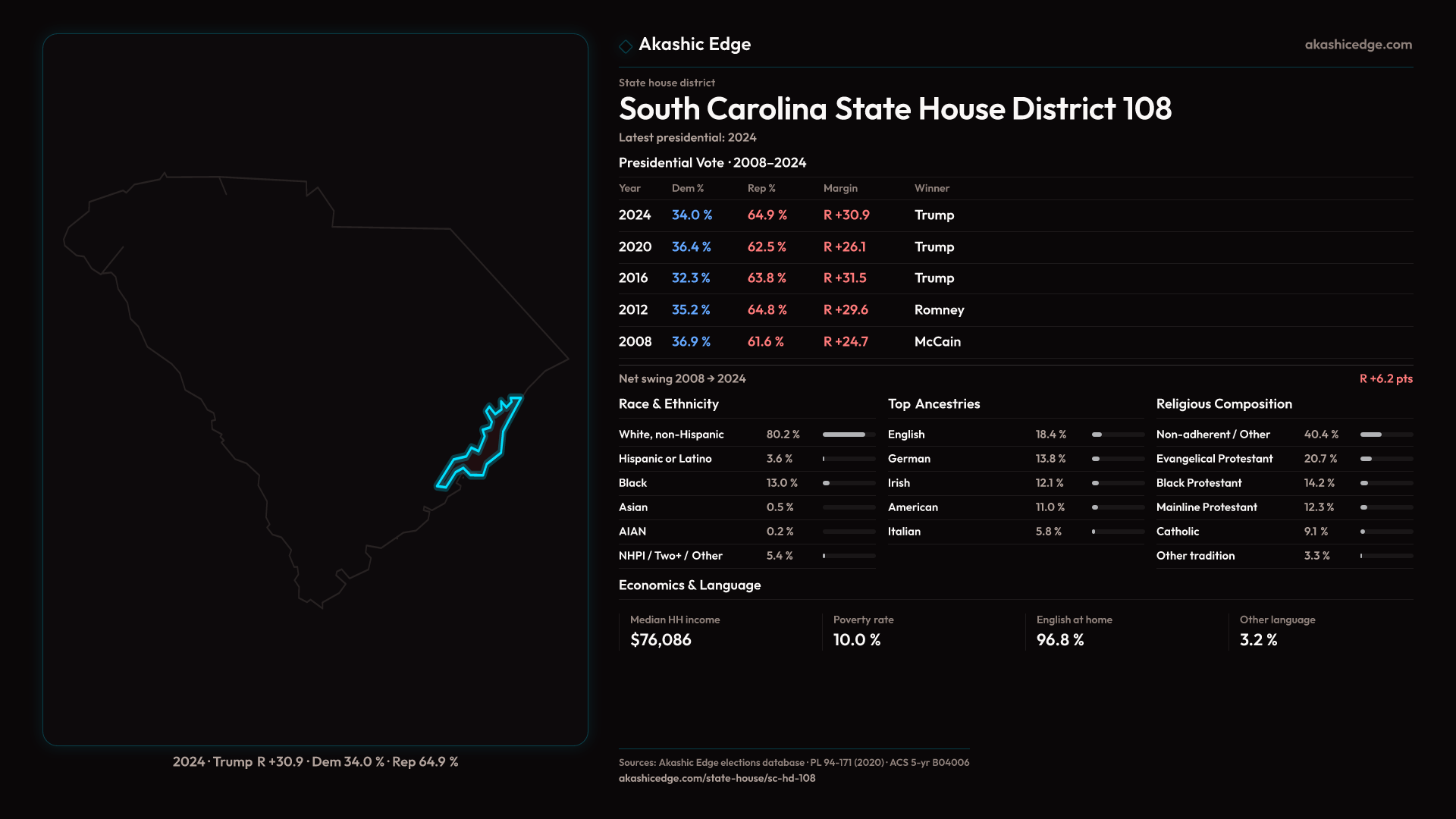 Who lives in South Carolina State House District 108? 40,316 residents as of the 2020 Census.