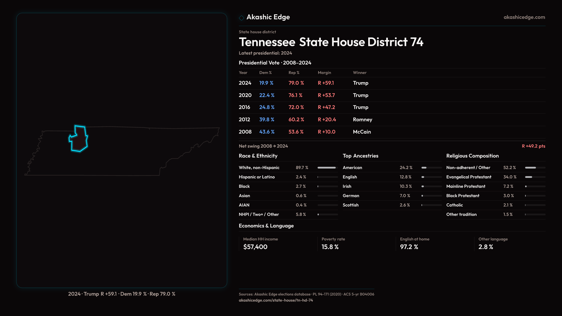 Who lives in Tennessee State House District 74? 68,223 residents as of the 2020 Census.