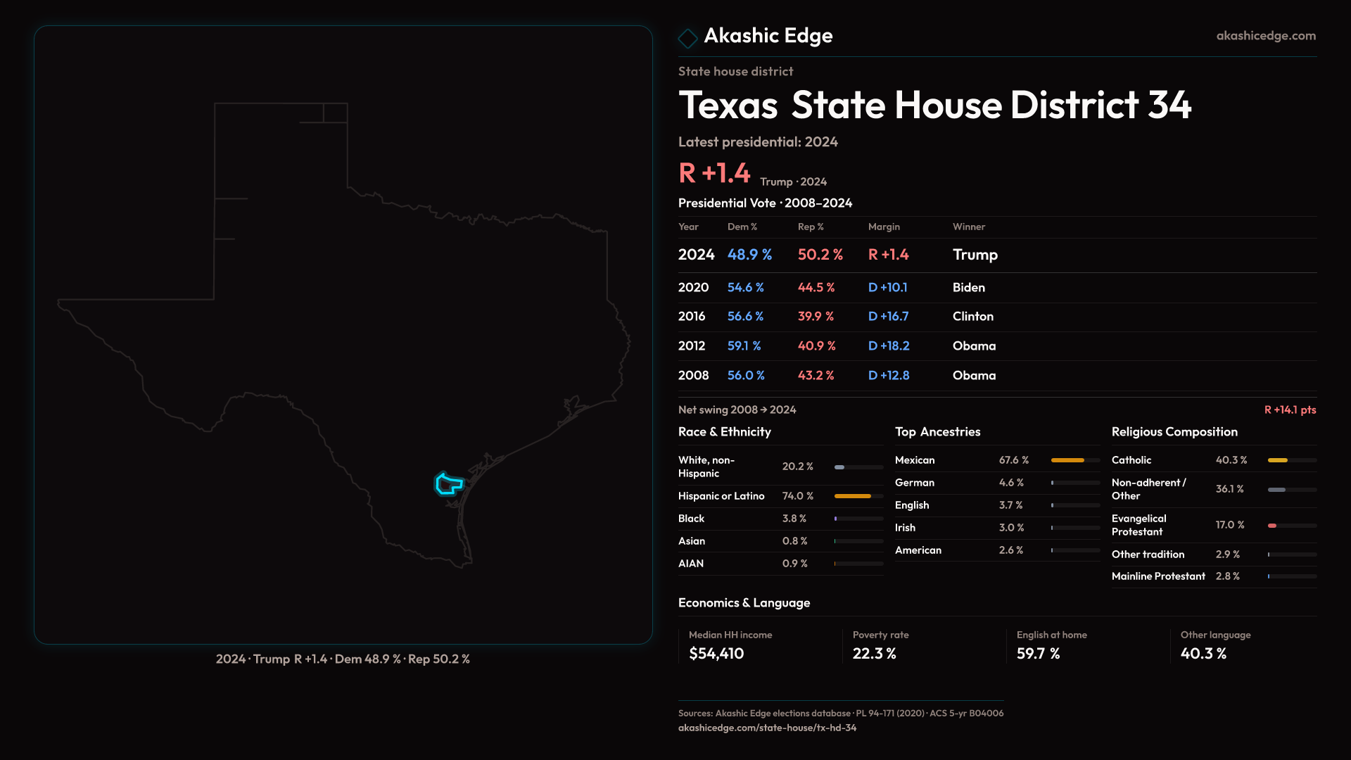 Who lives in Texas State House District 34? 189,560 residents as of the 2020 Census.