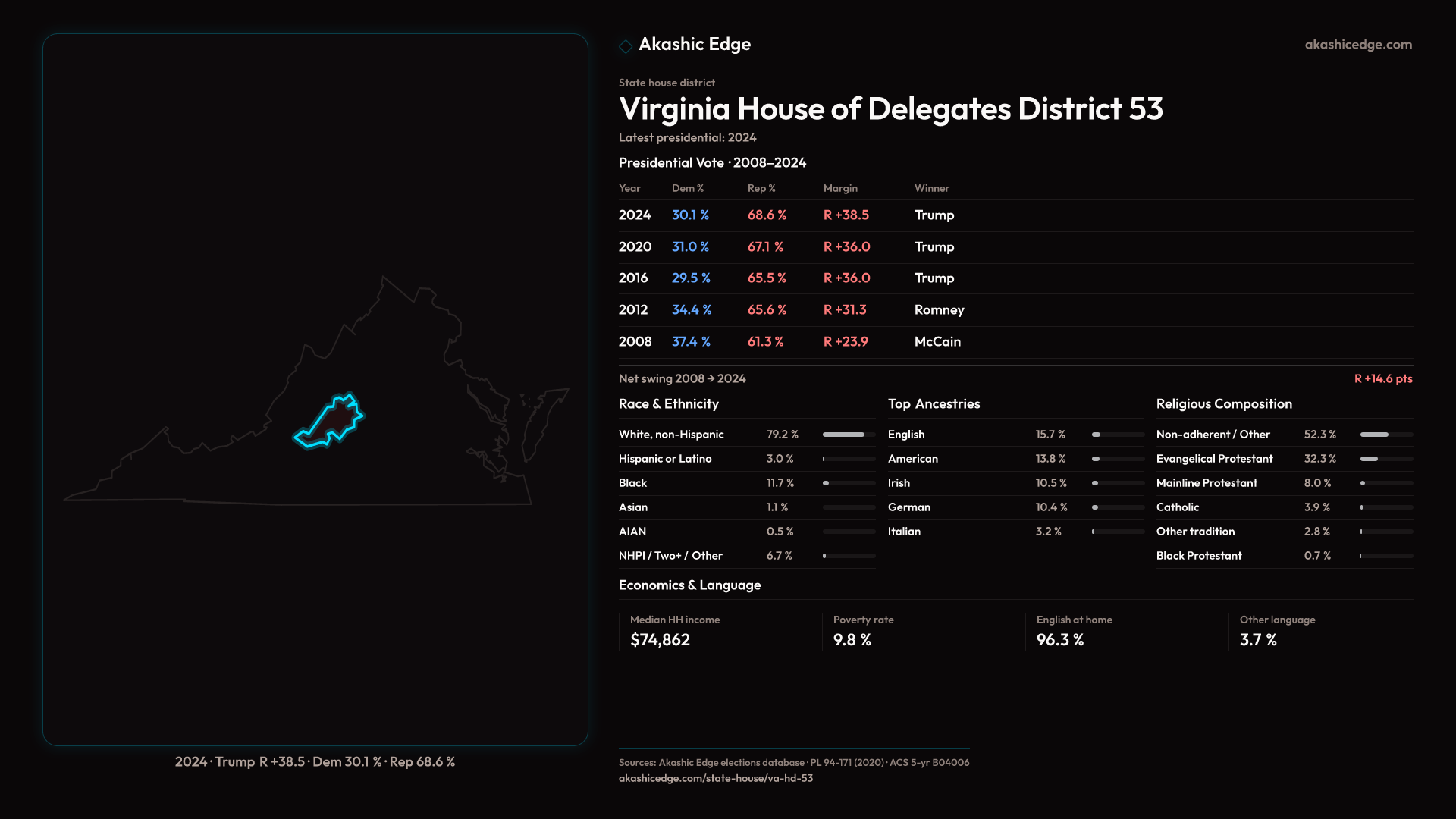 Read this geography's profile in three layers: local, state (where available), and national baseline.