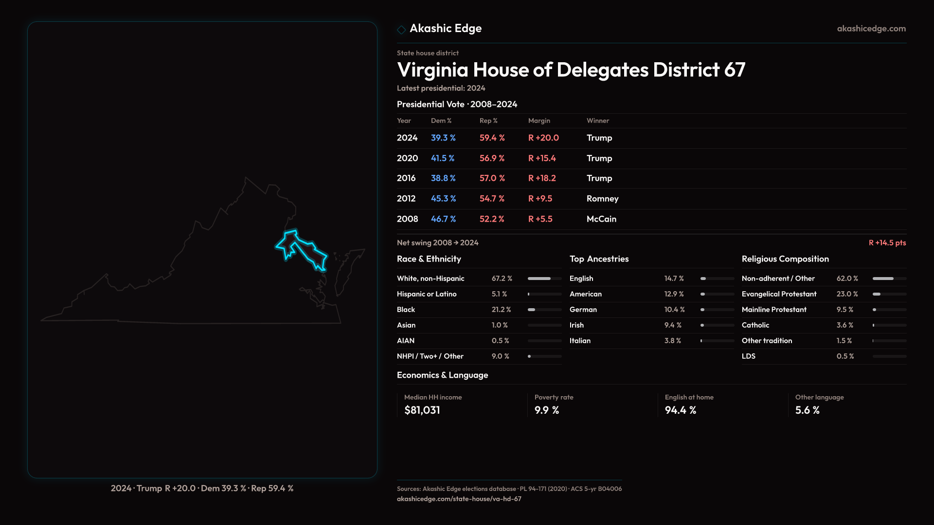 Who lives in Virginia House of Delegates District 67? 86,526 residents as of the 2020 Census.