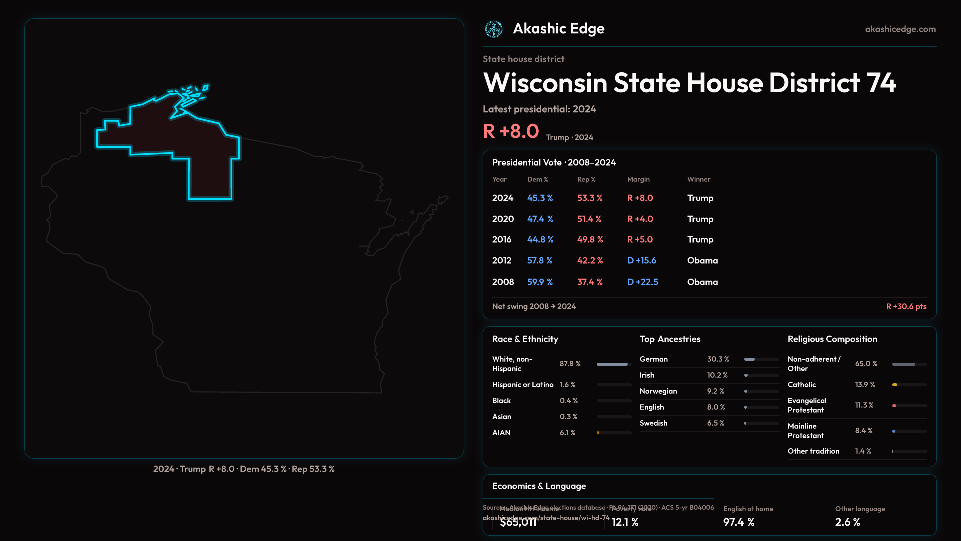 Who lives in Wisconsin State House District 74? 58,968 residents as of the 2020 Census.