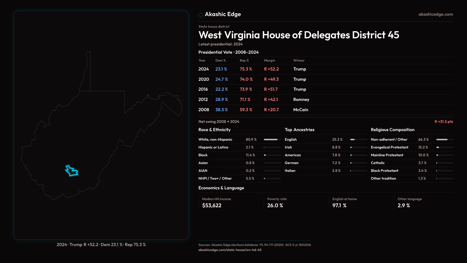 Read this geography's profile in three layers: local, state (where available), and national baseline.