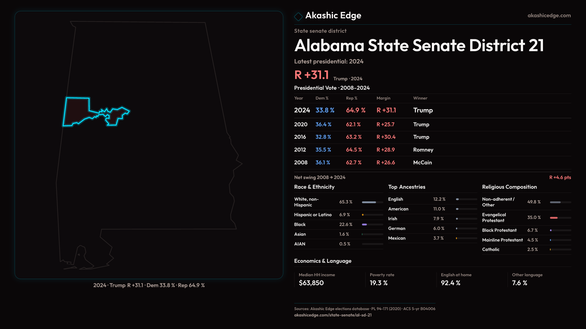 Read this geography's profile in three layers: local, state (where available), and national baseline.