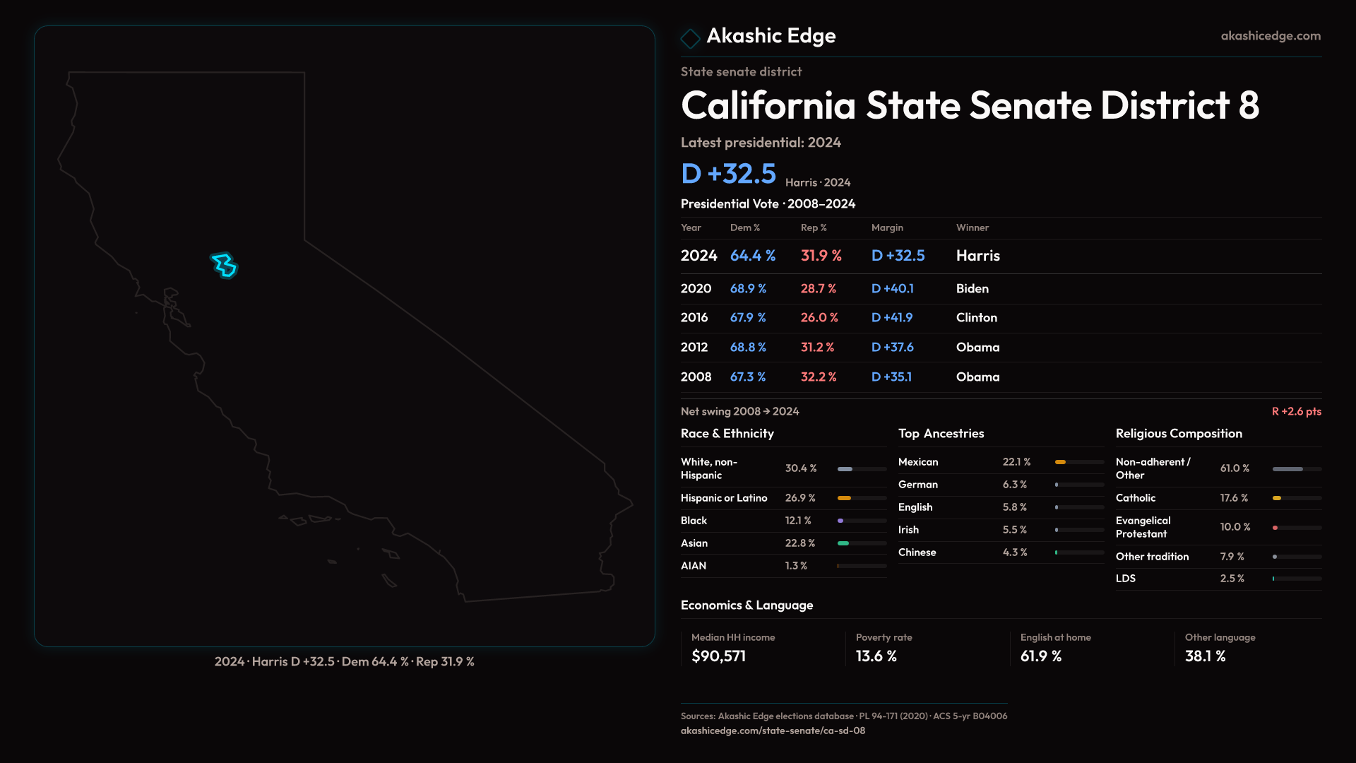 Who lives in California State Senate District 8? 941,931 residents as of the 2020 Census.