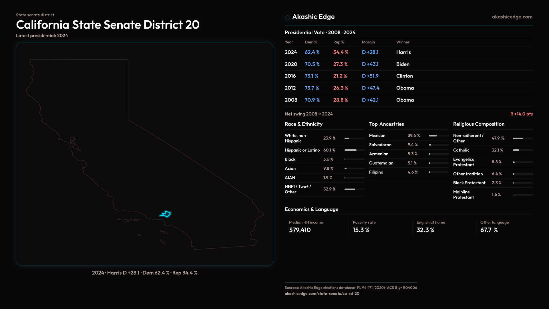 Who lives in California State Senate District 20? 942,906 residents as of the 2020 Census.