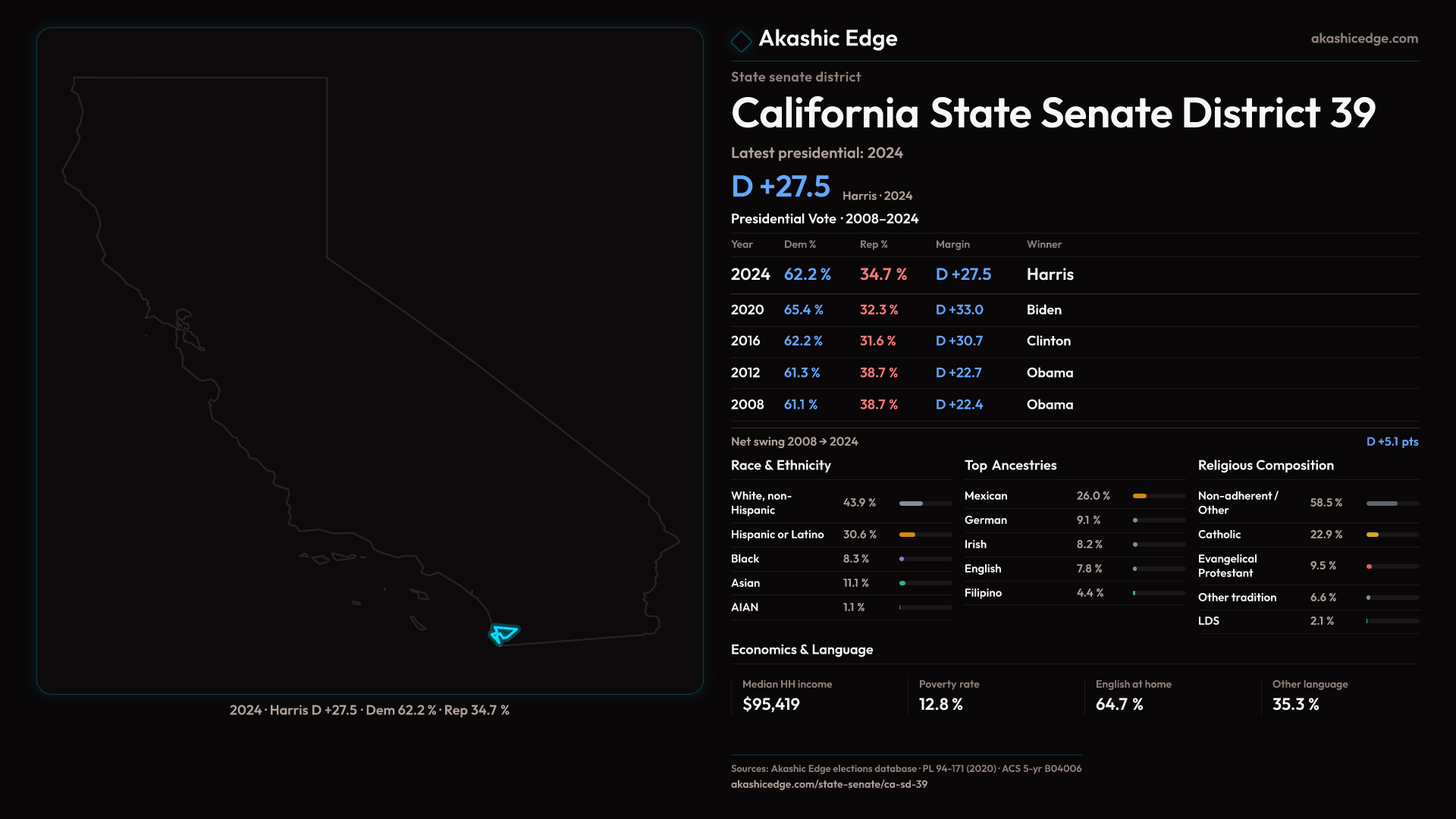 Who lives in California State Senate District 39? 1,032,507 residents as of the 2020 Census.