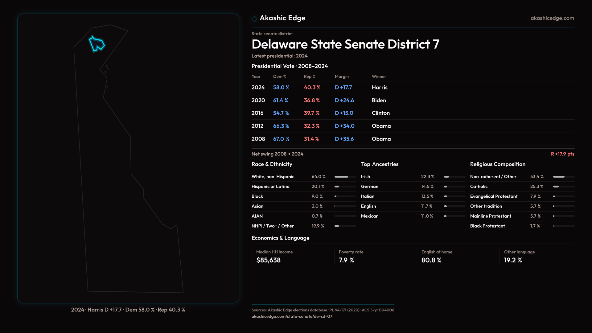 Safe Democratic — shifted 6.9pp toward Republicans in 2024 — 45K residents