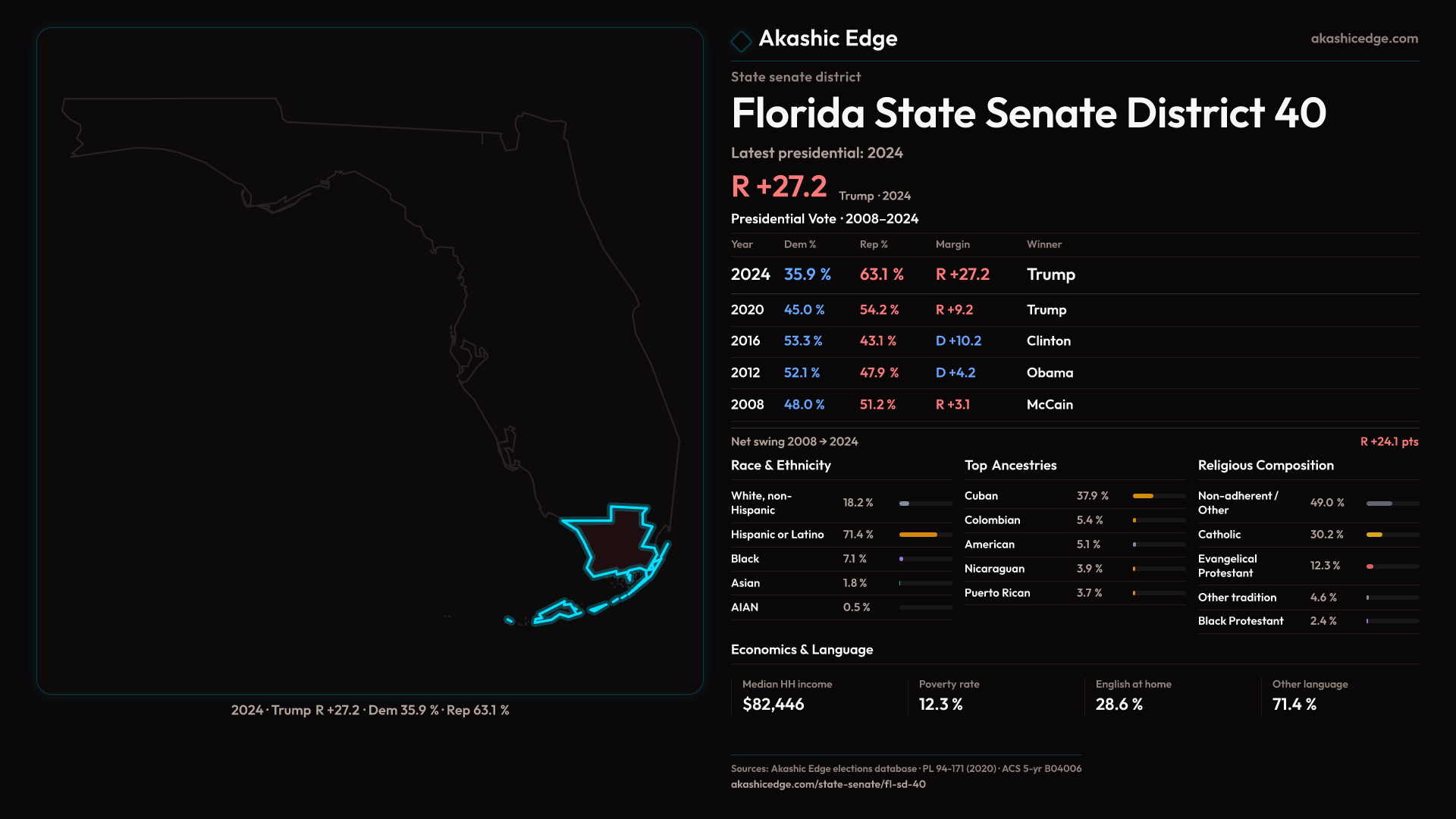 Who lives in Florida State Senate District 40? 542,532 residents as of the 2020 Census.