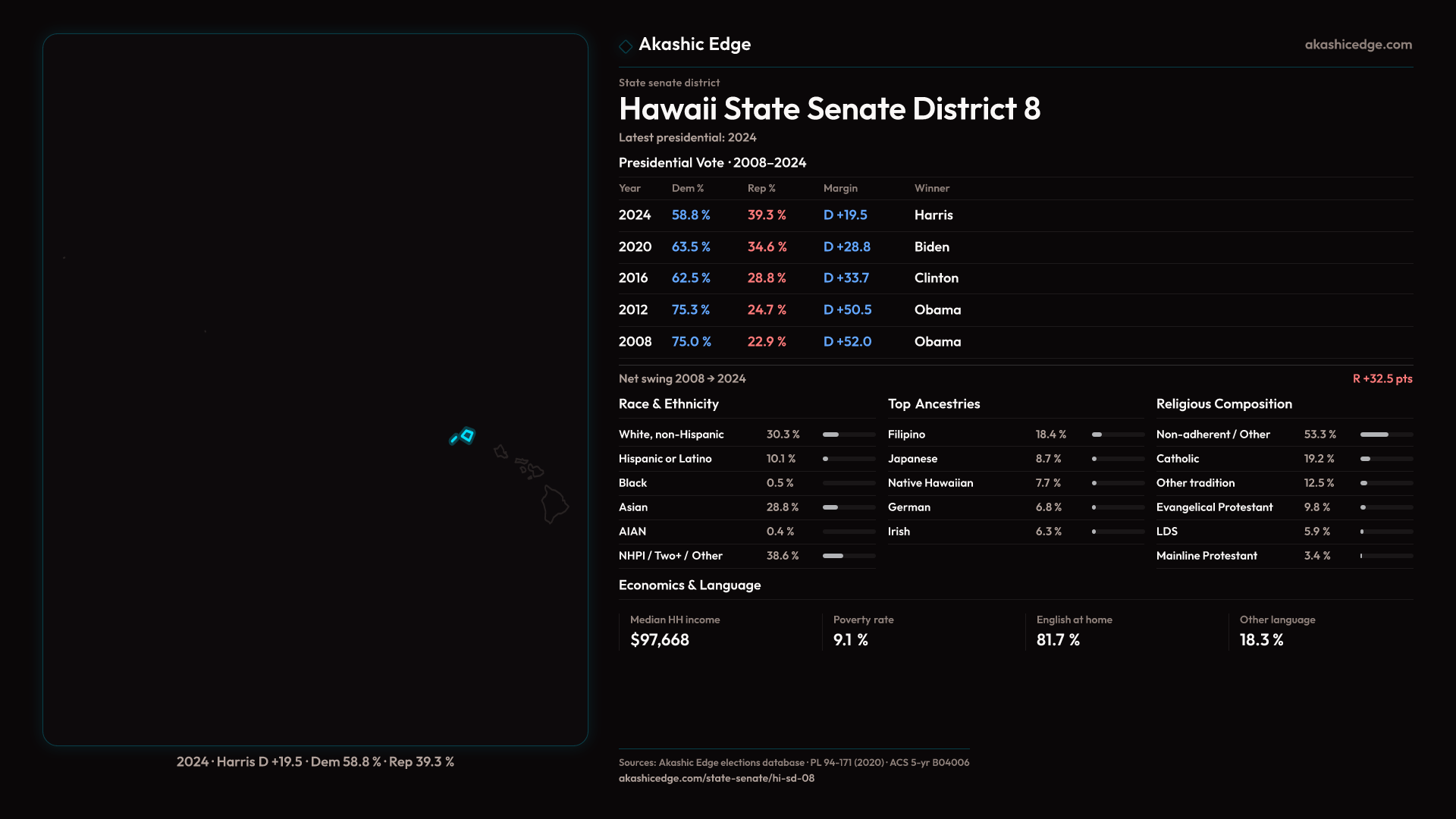 Who lives in Hawaii State Senate District 8? 73,200 residents as of the 2020 Census.