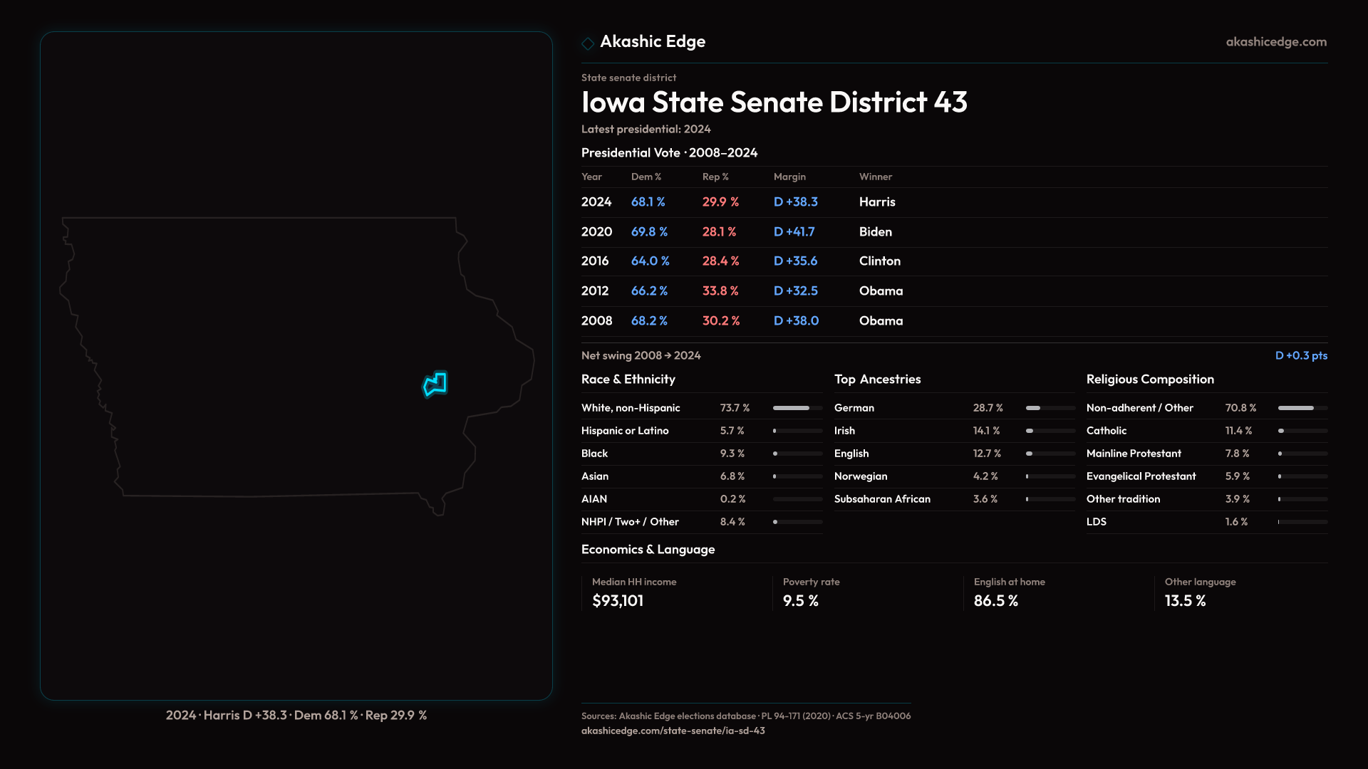Who lives in Iowa State Senate District 43? 64,185 residents as of the 2020 Census.
