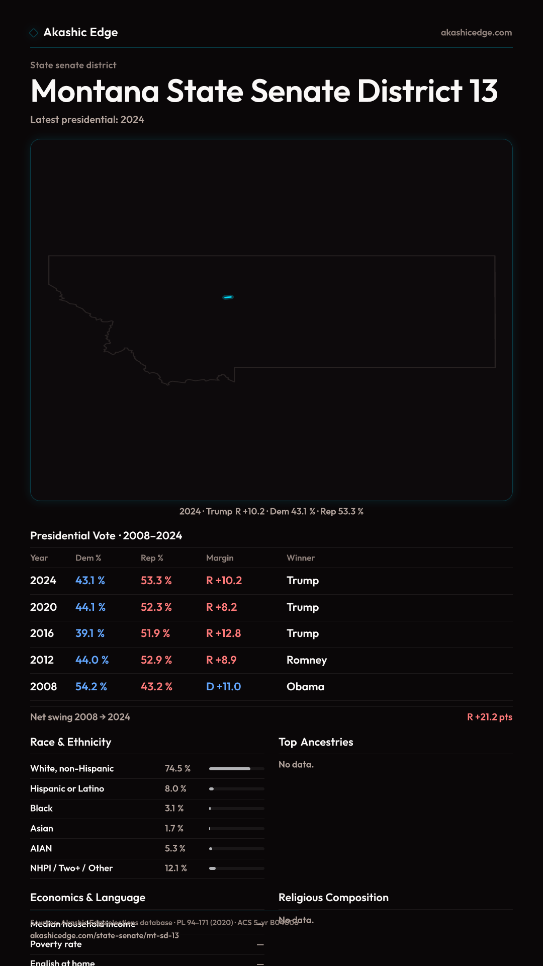 Who lives in Montana State Senate District 13? 20,232 residents as of the 2020 Census.