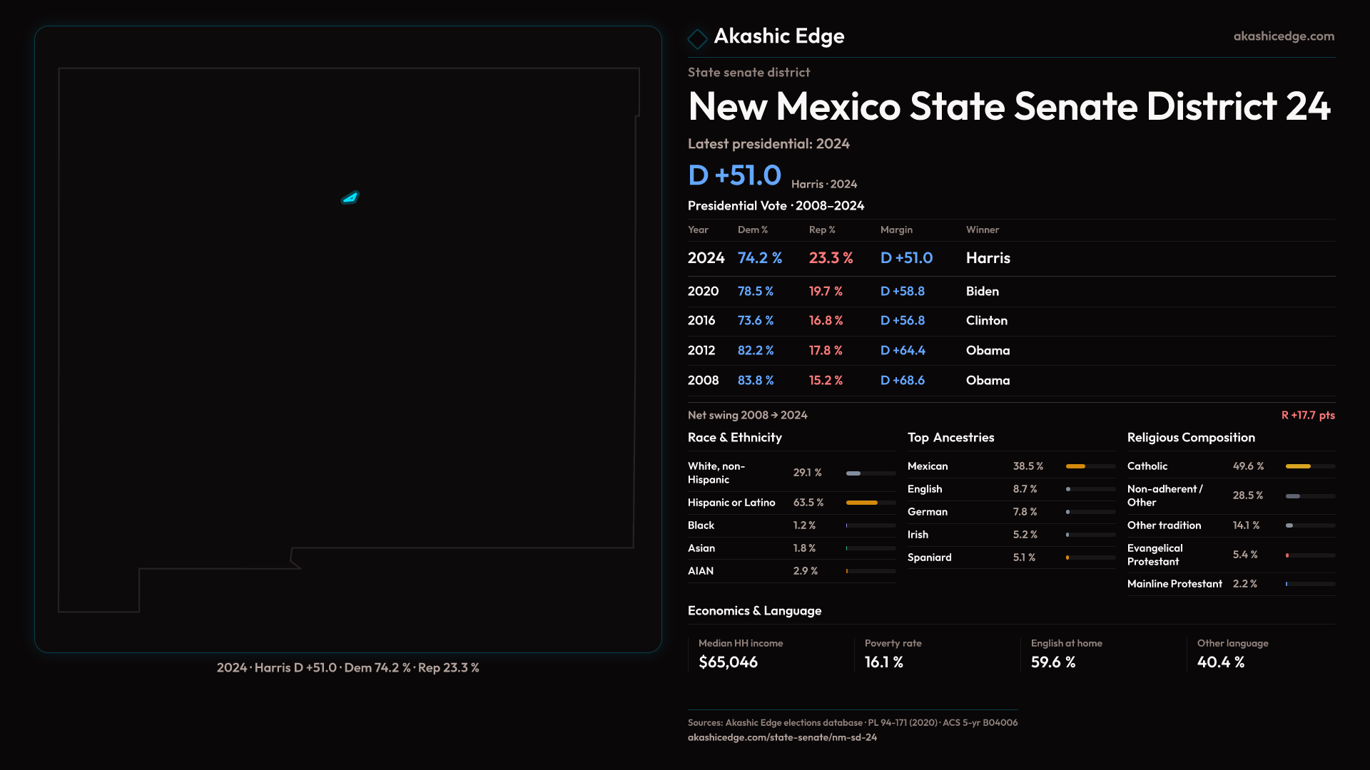 Safe Democratic — shifted 7.9pp toward Republicans in 2024 — 51K residents
