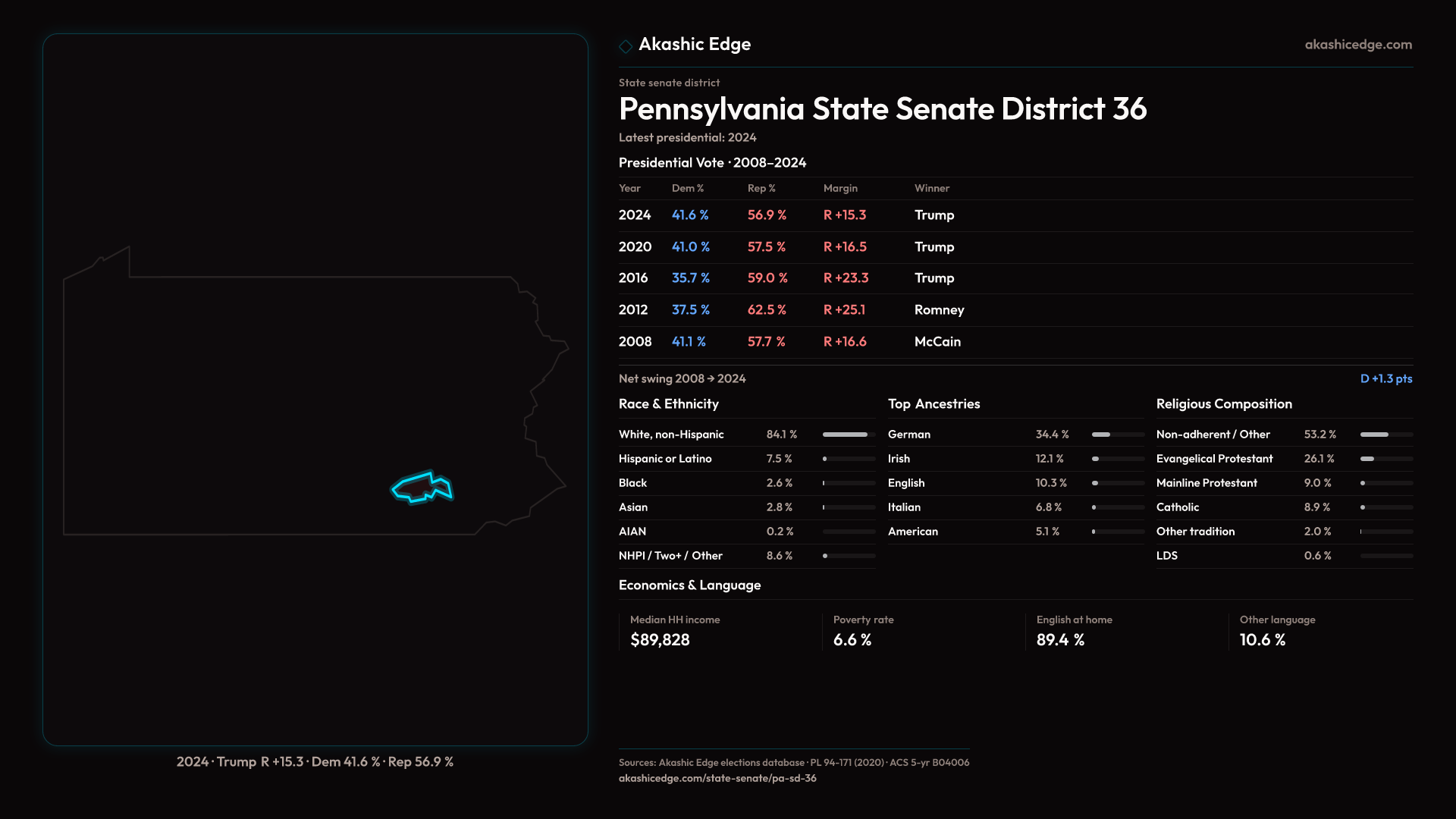 Who lives in Pennsylvania State Senate District 36? 268,842 residents as of the 2020 Census.
