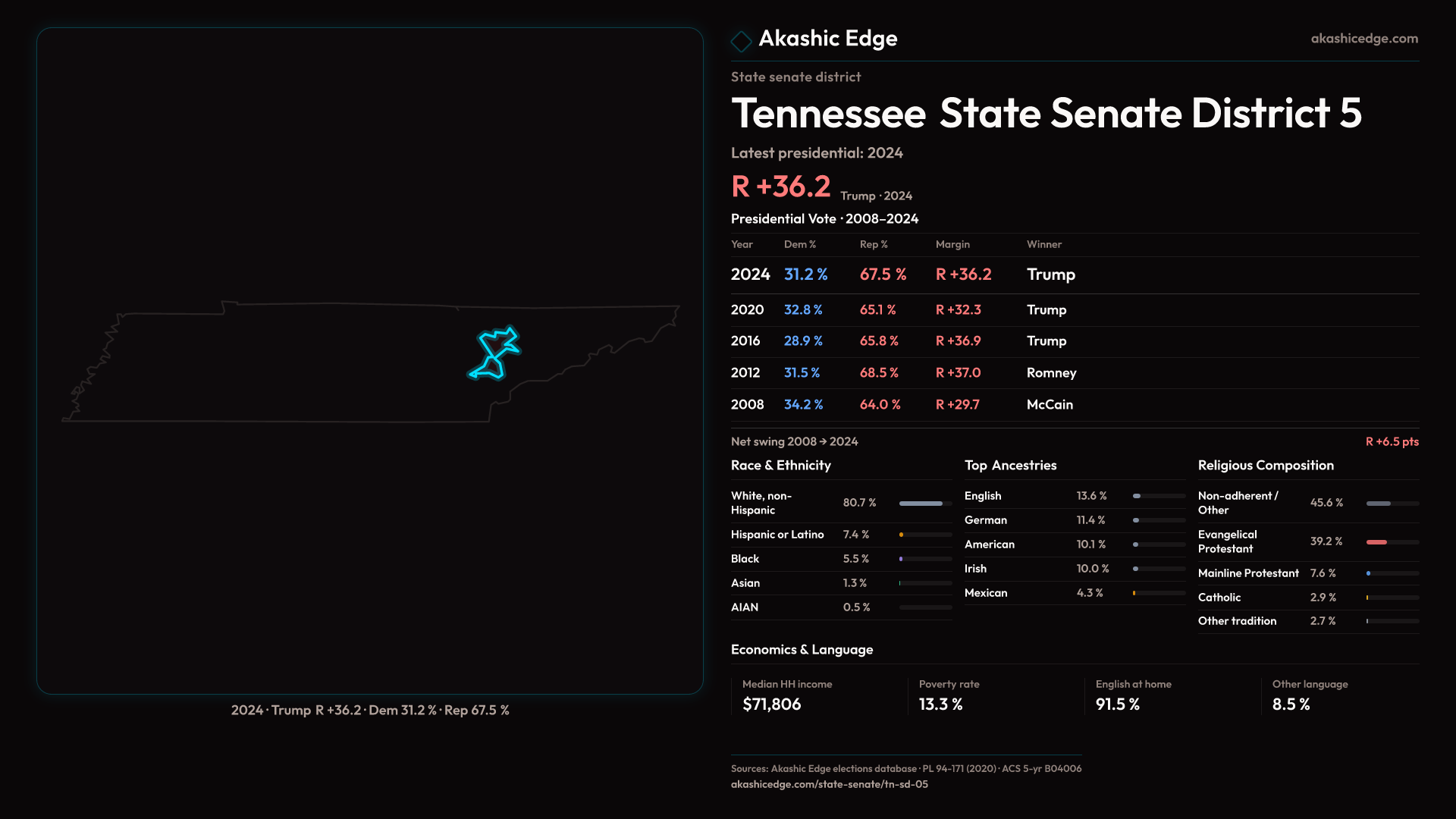 Safe Republican — shifted 3.9pp toward Republicans in 2024 — 203K residents