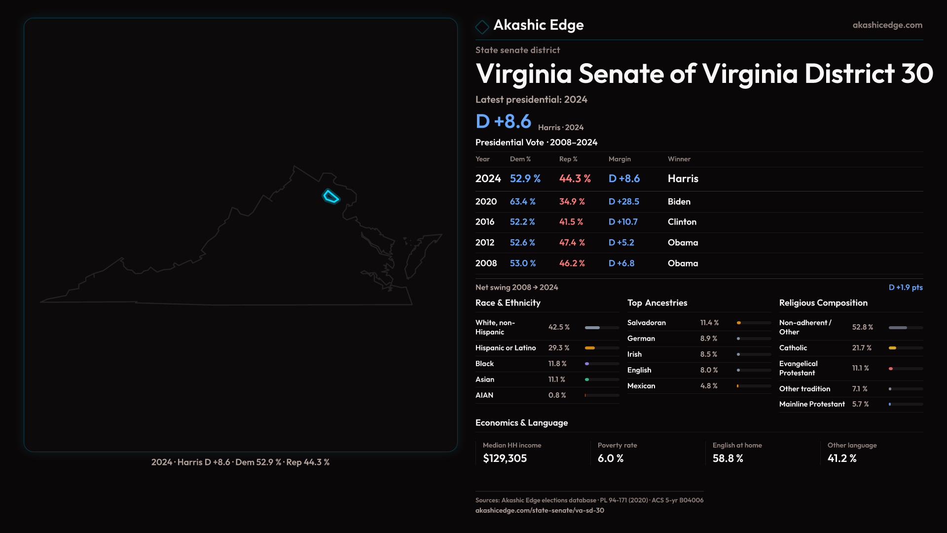 Who lives in Virginia Senate of Virginia District 30? 215,184 residents as of the 2020 Census.
