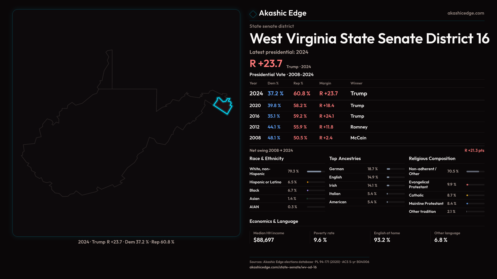 Who lives in West Virginia State Senate District 16? 110,223 residents as of the 2020 Census.