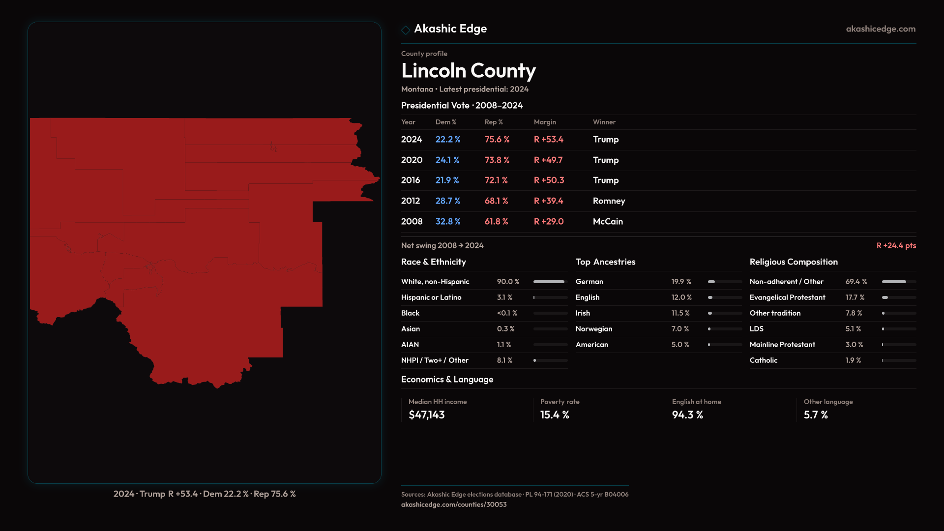 Shifted 3.7pp toward Republicans in 2024 — 29 presidential elections on record