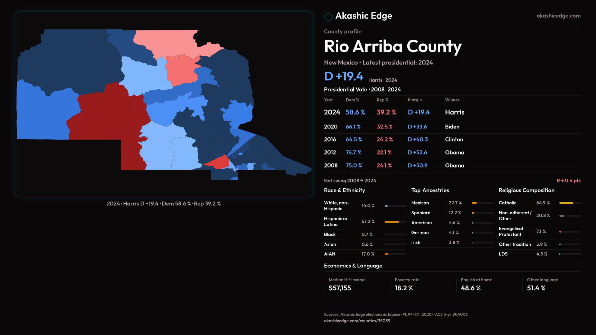 Safe Democratic — shifted 14.2pp toward Republicans in 2024 — 29 presidential elections on record
