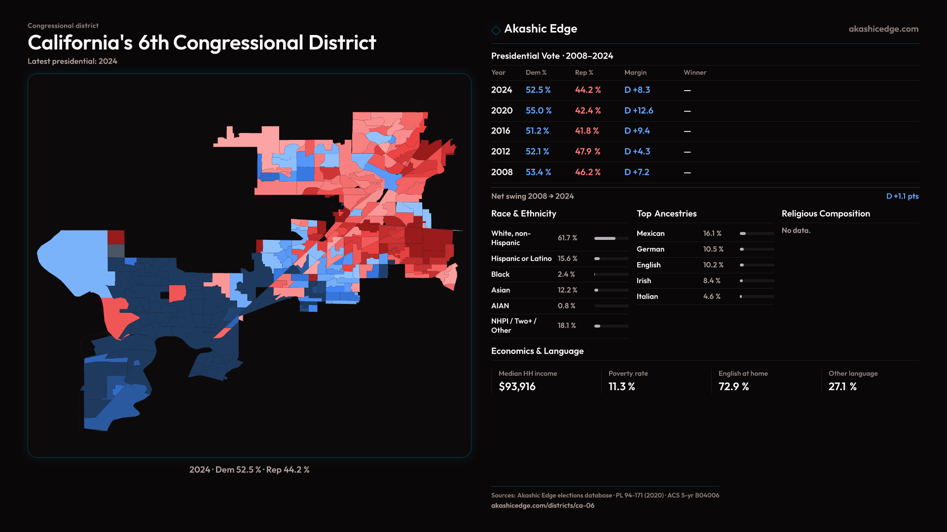 See how each split precinct fragment inside CA-06 voted, swung, and lines up demographically.