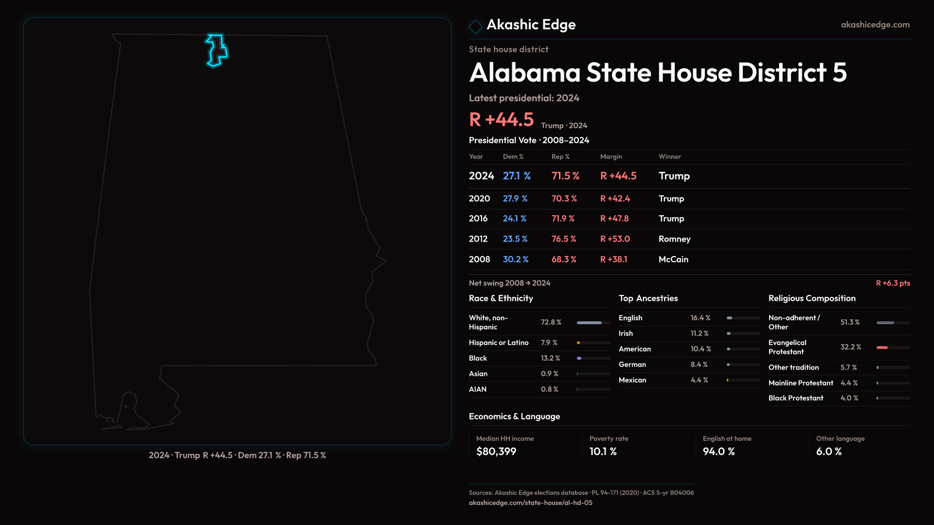 Read this geography's profile in three layers: local, state (where available), and national baseline.