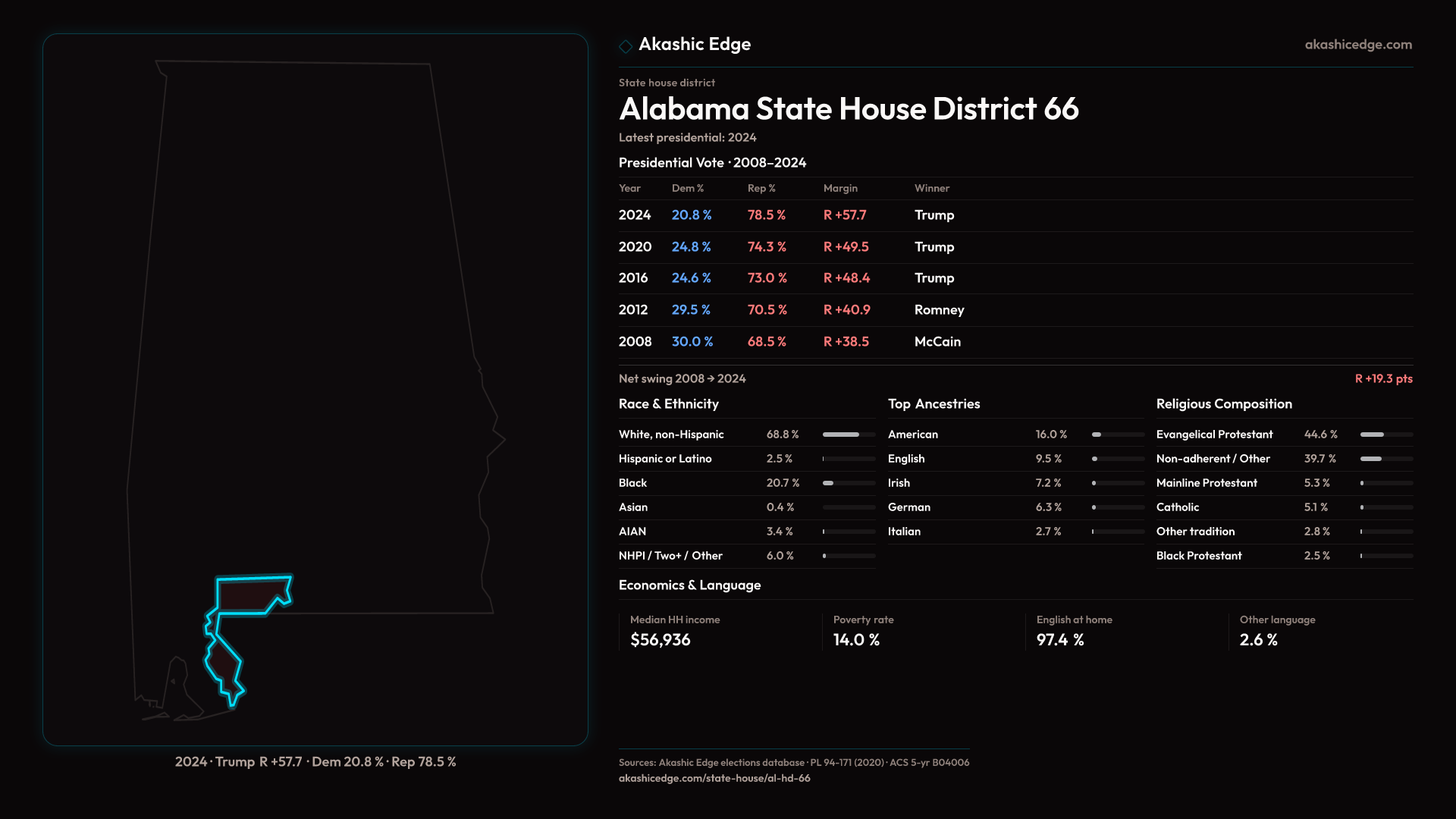 Read this geography's profile in three layers: local, state (where available), and national baseline.