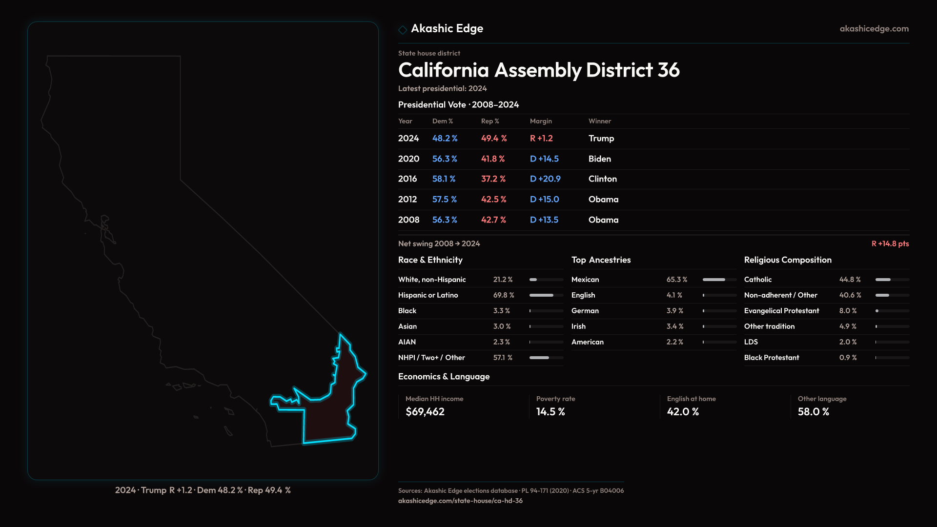 Who lives in California Assembly District 36? 474,655 residents as of the 2020 Census.