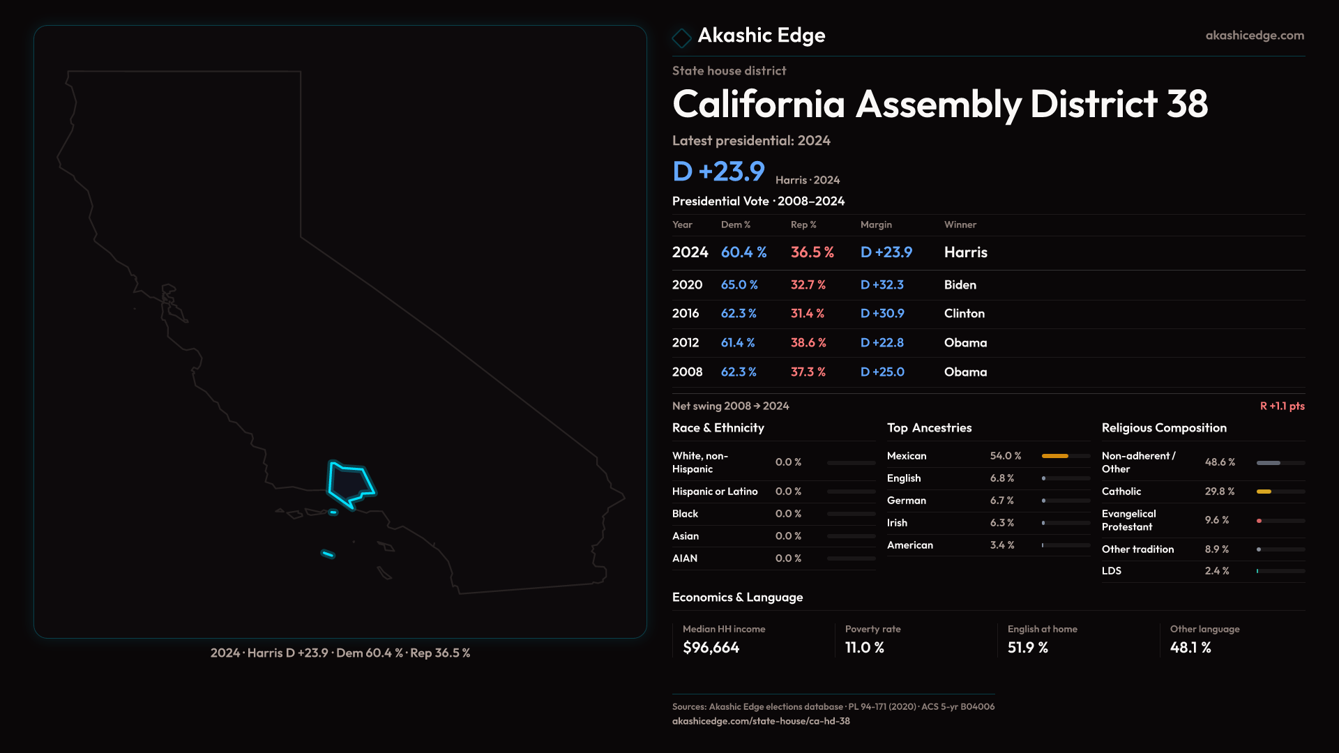 Who lives in California Assembly District 38? 484,301 residents as of the 2020 Census.