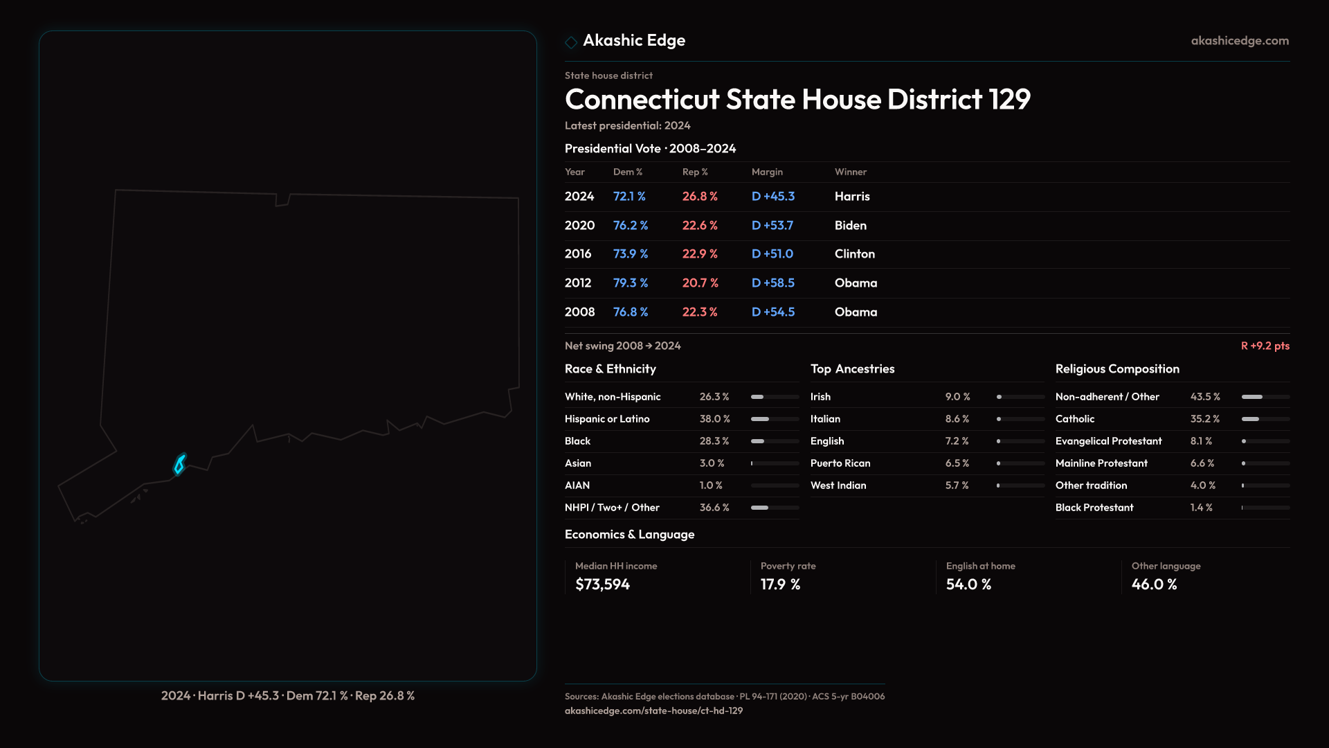 Safe Democratic — shifted 8.4pp toward Republicans in 2024 — 25K residents